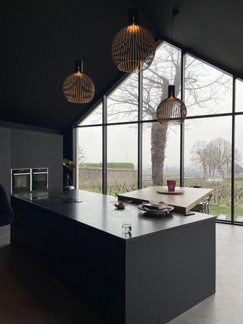 Au cœur de la côte viticole, la villa BO fait la part belle à la nature et revisite les codes de la maison traditionnelle bourguignonne. Véritable mise en scène, le mur cathédrale vitré baigne de lumières les espaces de vie - le salon s'ouvre sur le jardin, la cuisine révélé un panorama grandiose sur le vignoble, les persiennes en bois s'invitent dans l'escalier pour donner de la hauteur.